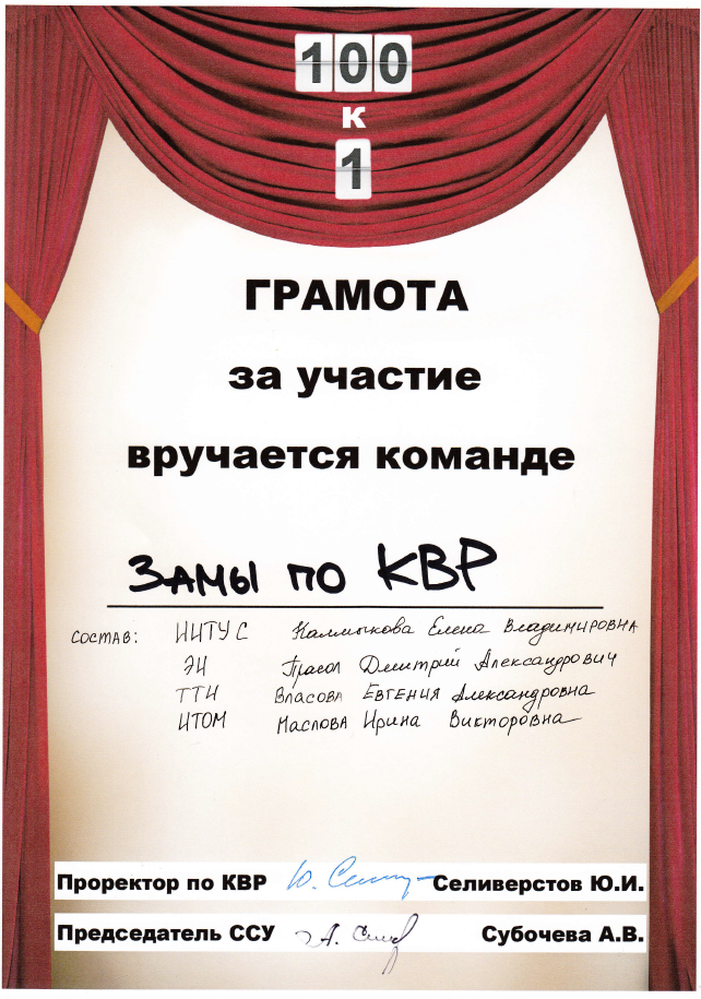 Команда «ЗАМЫ по КВР», к сожалению, не вышла в финал, но грамоту за участие заработала! Членом команды была и заместитель директора по культурно-воспитательной работе института технологического оборудования и машиностроения Мрина Викторовна Маслова.